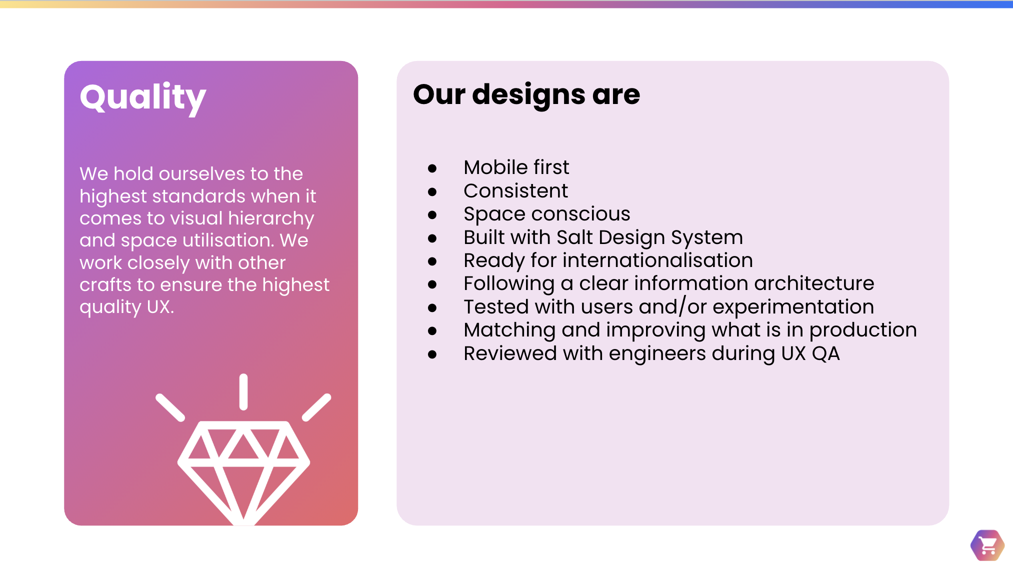 With so many designers working on the same ecommerce solution, having some guiding principles proved to be useful to create alignment and feedback on designs objectively. A lot of companies out there have design principles and so we decided not to re-invent the wheel, but take inspiration from them and make them work with our unique online grocery context. We ended up with 3 principles: Usability, Quality & Joy.